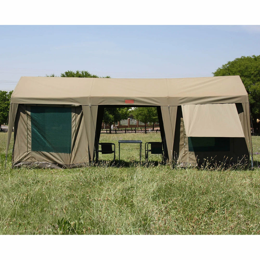 18ft X 10Ft Gazebo plus two 9ft X6Ft chalet tents with entrances facing each other across a 6ft opening. Sleeps six to eight people comfortably in the Hippo Solution, a great accommodation solution for parents wanting a little privacy from the kids or a group of friends camping in the great outdoors. Not only does it consist of two chalet tents linked together by a frame, the quick clip system enables an easy and rapid set up allowing you to get to more important matters, like preparing dinner. The modular design allows you to adjust between cabins or having a large open gazebo. You can also easily fit the mesh diner in between the chalets or in place of one of the chalets. Includes built in PVC floor with six inch side walls to protect against flooding and a double full zipper entrance both in the front and back, allowing you to walk through or to fold up the sides. Outfit your outdoor living space with Camp Chairs or Camping Tables to take in the outdoors!