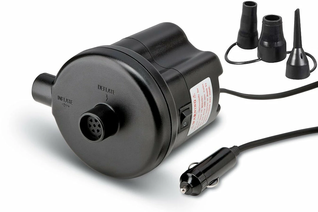 Pittman Outdoors Portable Air Pump with 16′ Cord & DC Automotive Plug is designed to plug into your trucks cigarette lighter/utility plug and inflate your AirBedz while in the truck bed. Also handy for other inflatable’s when your vehicle is the only power source available. 3 Universal Adapter Fittings Included. It comes with an extra-long 16-foot cord to extend comfortably from your car and has three universal valve adapters — so you can bet that whatever you’re trying to inflate will be ready in no time flat.