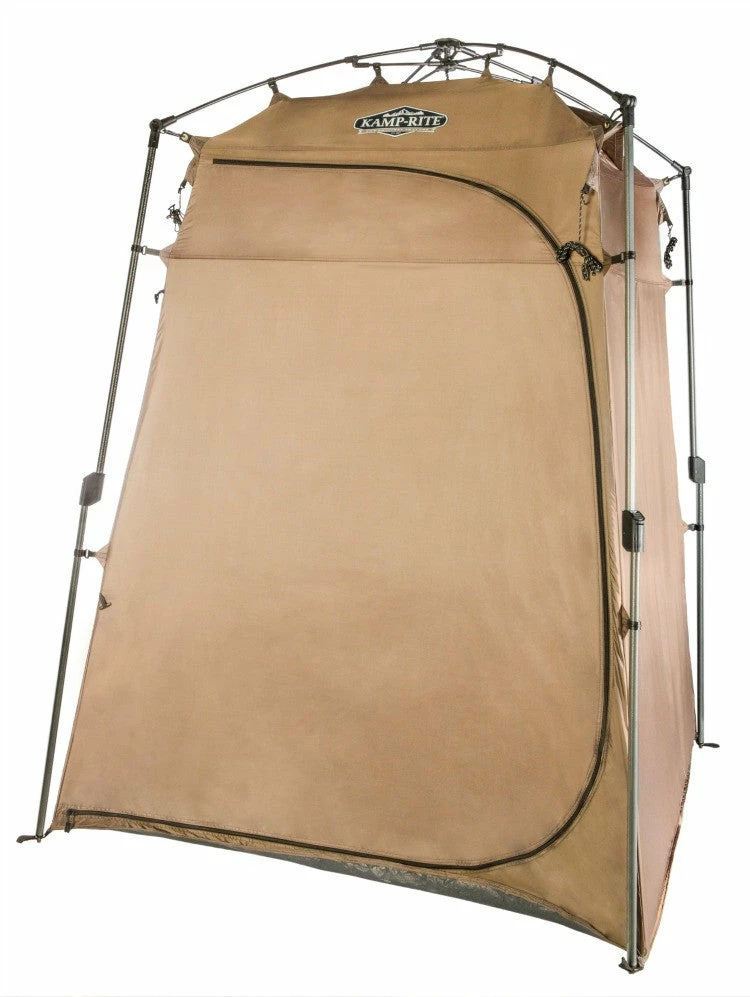 The Kamp-Rite Privacy Shelter With Shower offers a fully enclosed space for changing, showering or other personal needs. Quick and easy to setup, the Privacy Shelter includes a 5-gallon portable shower unit that attaches to the shelter’s strong and rigid steel frame. The large, zippered D-shaped door allows for easy entry and the inner mesh pockets keep your small personal items conveniently within reach. The versatile shelter features a detachable floor with mesh panel to allow for water drainage and to accommodate a variety of uses. The Privacy Shelter With Shower folds down compactly into the included Carry Bag for easy transport and storage.