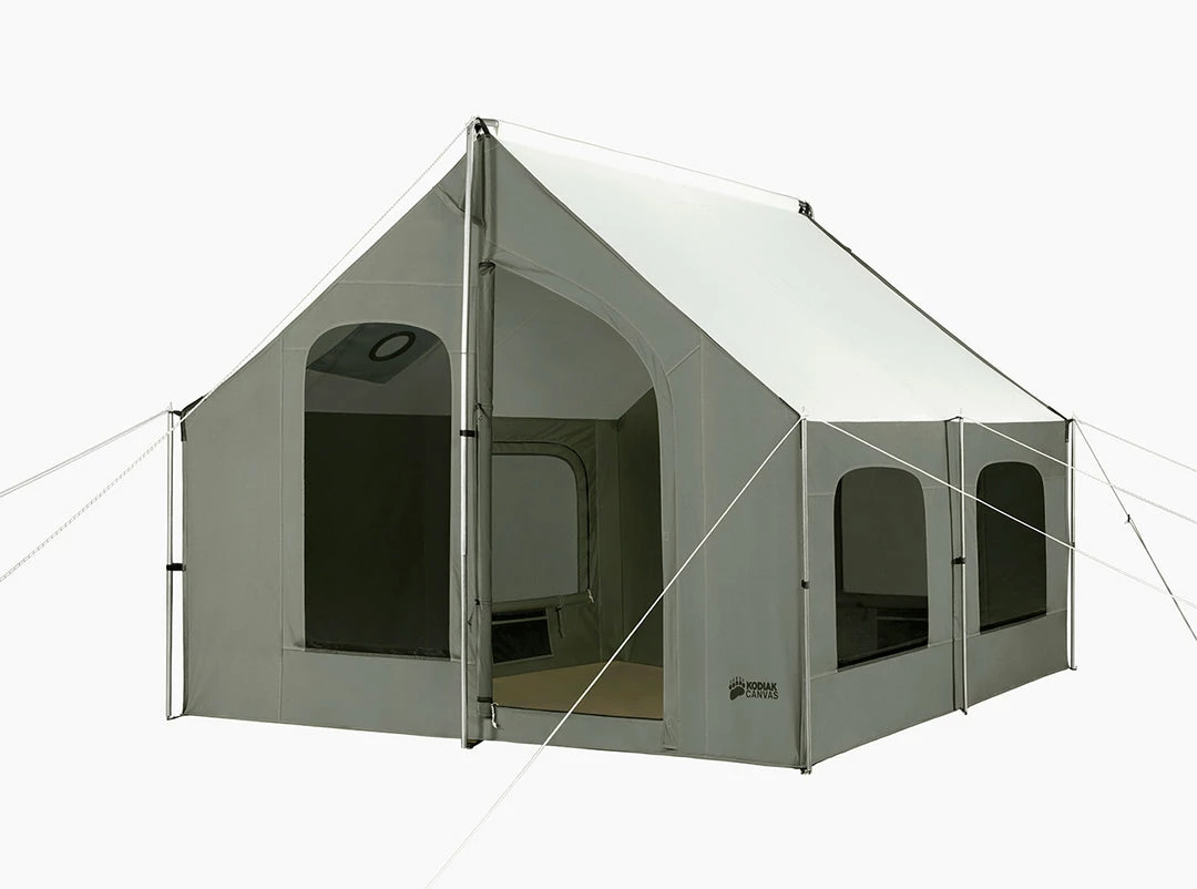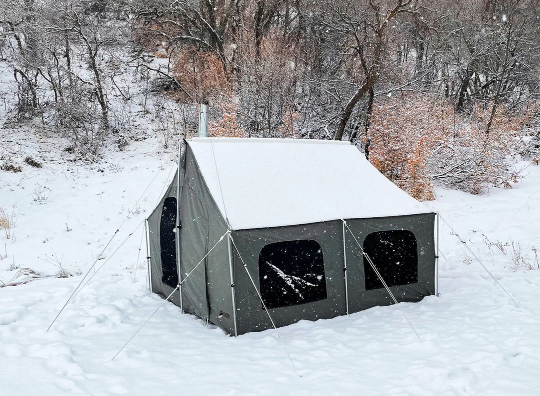 The newest member of the Kodiak Canvas Stove Ready (SR) tents. The Kodiak Lodge 10×10 tent where rugged meets refinement. Made with high performance Hydra-Shield, the tight weave and silicone finish make the canvas watertight and breathable, minimizing codensation and mugginess that are common with synthetic tents. Provide a roomy interior with stand-up, walk-around comfort. The large front door means no crouching when you come and go. also featuring no-see-um, screen mesh that keeps the smallest bugs out. A covered storm window and vents can be opened to circulate outside air, even when rainy. This design, a frame with 1-inch, galvanized, steel tubing will hold up to strong winds and snow loads. A stove jack allows for use of a wood burning stove to keep you warm when temperatures drop. (If using the tent without a stove, just zip the stove jack cover closed). Requires two adults for setup. and storage bags included.