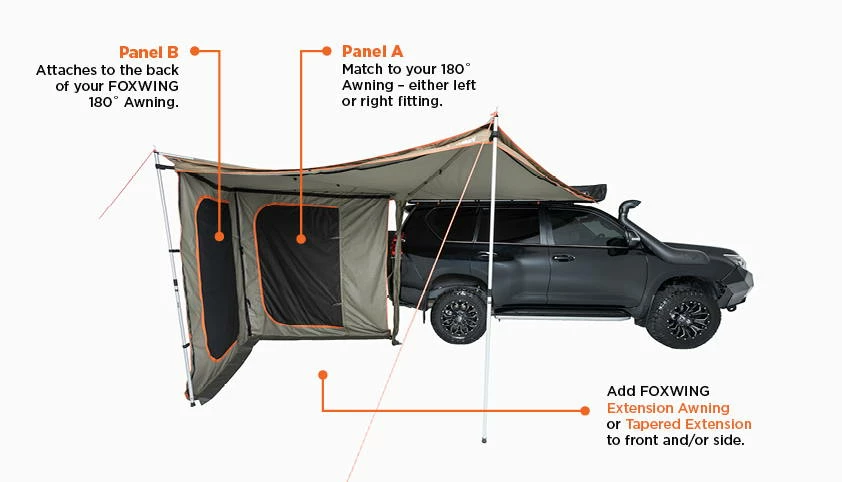 With simple and convenient zipper access the FOXWING end panels, combined with side panels, means you can now fully enclose your 180° FOXWING for protection from the elements and to create your own private enclosed living area. Each pair consists of an ‘A’ Panel, for use closest to the rear of your vehicle – which comes as either a Left Hand or Right Hand model, to match your 180° Awning. Each pair also consists of the ‘B’ Panel which fits both RHS and LHS 180° Awnings.
