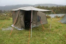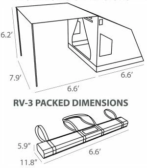 The OZTENT RV-3 was the second of the famous Oztent models to be released. The RV-3 is a bigger tent when erected but it packs down to the same length in the bag as the RV-2. The RV3 is a combination of the RV2 & RV4 making ideal for the camper looking for the width of an RV4 which is (8′) wide but keeping the depth of an RV2 (6’6″), The RV-3 when used with travel trailers with the optional caravan connector accessory connects to an RV with the use of a sail track (provided on most RV units) to the front awning of the RV3 tent, or connect 2 RV3’s together with an awning connector accessory for an increased living space. Teardrop trailers also benefit for use as a side tent companion, cooking, changing clothes or for a relaxing space out of the elements. Adding the peaked side panel or front panel accessory creates privacy, and the back room space is ideal for gear storage or a sleeping area for guests!