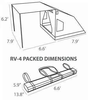 The OZTENT RV-4 is an evolutionary change on the RV-3 model. It maintains the same pack size as the RV-3 but has an innovative pullout floor section at the back to give you more space. Bigger tent same pack size! The RV-4 offers a one person set up in less than 30 seconds making it ideal for teardrop trailers, travel trailers & RV’s! When used with a Caravan Connector Accessory allows a connection from the RV to the front awning of an RV4 with the use of a sail track (provided on most RV unit). By attaching an Awning Connector Accessory to 2 RV4’s expands the size of the living area, Teardrop trailers also benefit using the RV4 as a side tent accessory, providing a space out of the elements, changing clothes or a cooking area under the front awning by using the Mesh Floor Saver allows for an easy clean up while not accumulating water! Adding the Deluxe Peaked Side Panels or using the Deluxe Front Panel creates a partial or full enclosure for privacy. The back room is an ideal space for gear storage or additional sleeping area for guests!