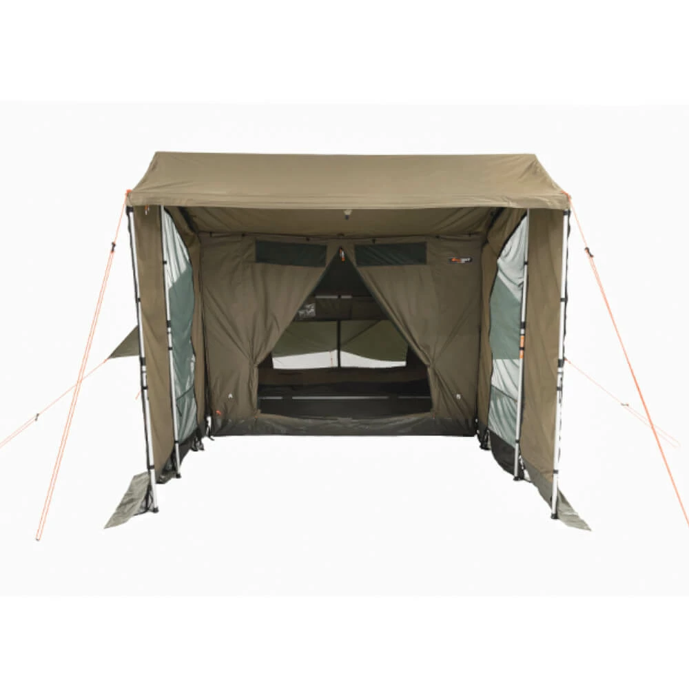 They simply and easily zip to the awning and side of the tent. They are made from the same waterproof Ripstop Polycotton Canvas as the tent. The Peaked Side Panels also have a zippered canvas door and a zippered superfine mesh screen door in each side.