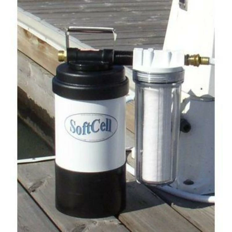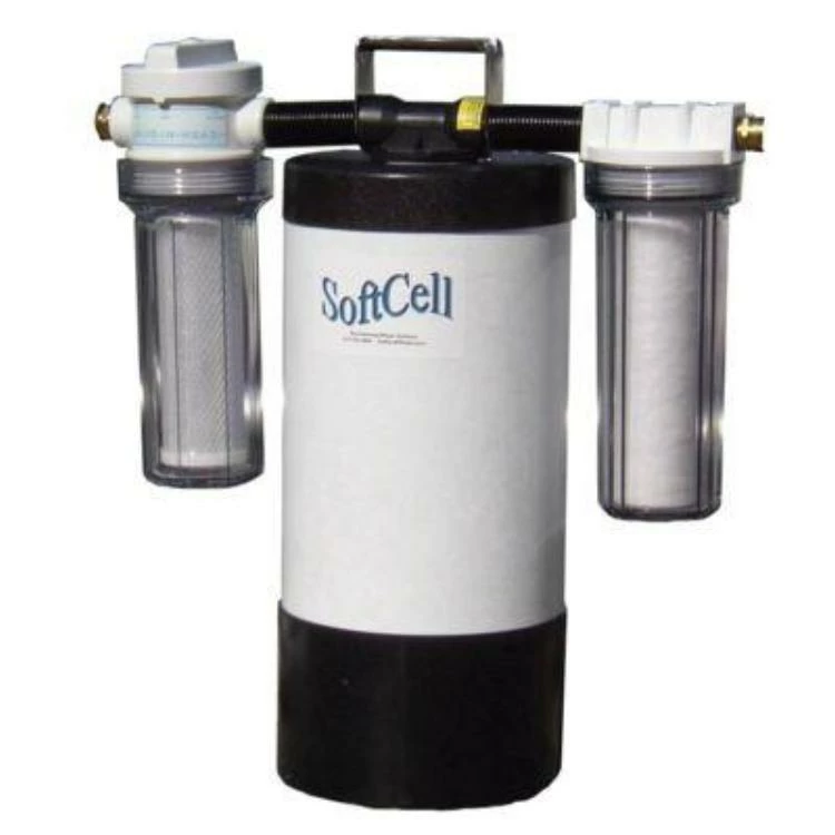 - The SoftCell Dual RV portable water softener with attached Sediment Pre-Filter and Post-Filter Housing is a perfect unit for applications needing additional filtering to improve taste and eliminate odors. Softens up to 5,000 gallons…