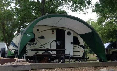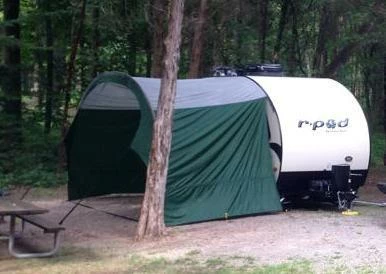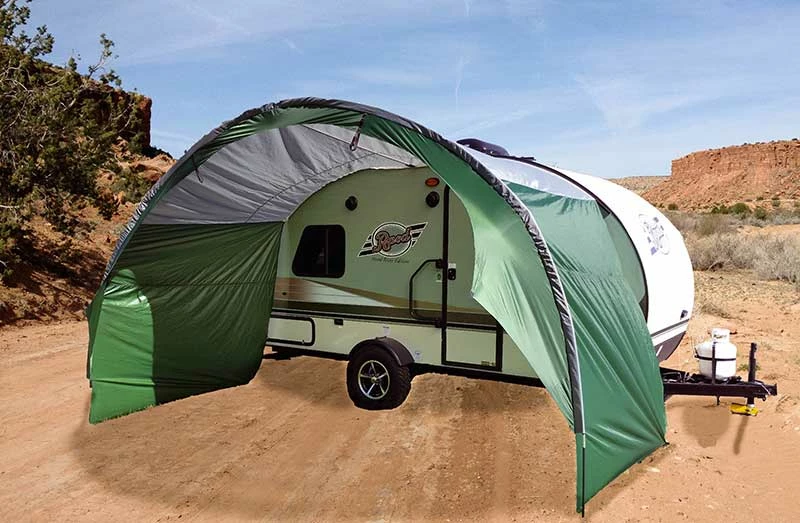 - The R-Pod Awning provides a roomy 13′ wide x 8′ deep x 7.5′ tall sheltered area