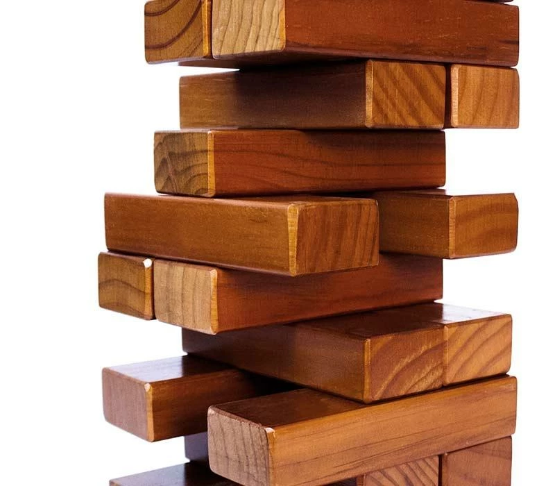 This Giant Sized Jumbling Tower set is made with beautifully crafted stained solid pine wood and is hand cut and sanded for smooth game play. Please note that the bottom level has two bonus timbers to begin – using 56 timbers allows for the easiest packing arrangement and adds more height to your tower.